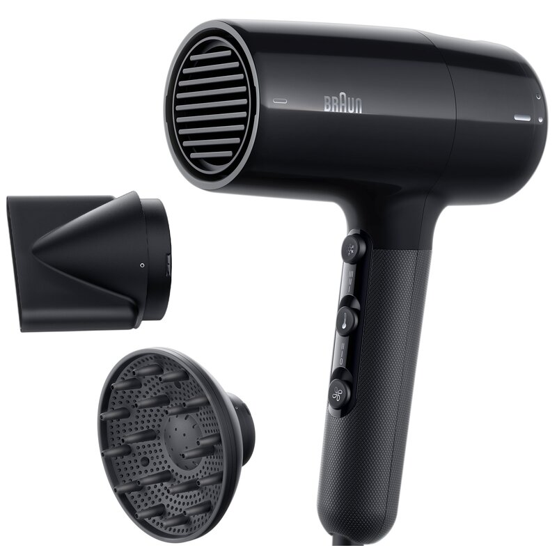 Suszarka od Braun o mocy 2200 W. Specjalna technologia jonizuje włosy i sprawia, że lepiej się układają. Posiada 2 końcówki (dyfuzor i koncentrator).