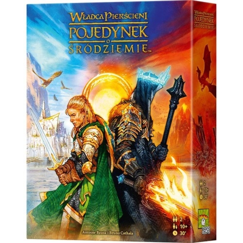 Stajesz się panem Śródziemia. Możesz wcielić się w postać Saurona, który posyła wojska pod bramy miast, by pochwycić Sama i Froda lub dowódcy Drużyną Pierścienia i obrońcy wolnych ras. "Władca Pierścieni: Pojedynek o Śródziemie" jest grą strategiczną opartą na takich samych regułach jak "7 Cudów Świata: Pojedynek". Została opracowana w taki sposób, by zawodnicy wzajemnie się kontrolowali, a każdy ruch miał istotny wpływ na ostateczny wynik. Za sprawą nowych rozwiązań tj. zmiana toru militarnego na wyścig czy pojawienie się planszy z mapą rozgrywka staje się jeszcze ciekawsza. Nie będą się z nią nudzić fani twórczości Tolkiena ani wytrawni użytkownicy planszówek. "Władca Pierścieni: Pojedynek o Śródziemie" składa się z trzech rozdziałów, w trakcie których zawodnicy rozwijają swoje strategie przy udziale płytek ważnych miejsc i kart rozdziału. Uczestnicy gry mogą przeć do zwycięstwa na trzy sposoby: poprzez ukończenie Wyprawy Pierścienia, zawarcie sojuszy z sześcioma rasami albo budowanie swojej obecności w różnych rejonach Śródziemia. Zawartość: plansza główna 4-częściowy tor 69 kart 44 pionki 18 żetonów 30 monet 7 płytek pomoc gracza instrukcja Liczba graczy 2 Wiek 10+