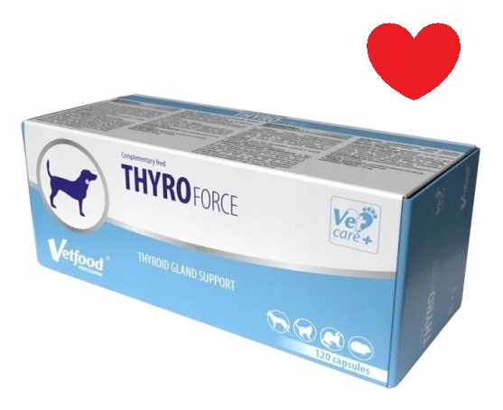 Vetfood Thyroforce to specjalistyczny suplement diety przeznaczony przede wszystkim dla psów z zaburzeniami funkcji tarczycy, najczęściej z niedoczynnością. Jest to produkt w formie kapsułek, co ułatwia precyzyjne dawkowanie w zależności od masy ciała psa, a także pozwala na podawanie zawartości kapsułki z pokarmem.