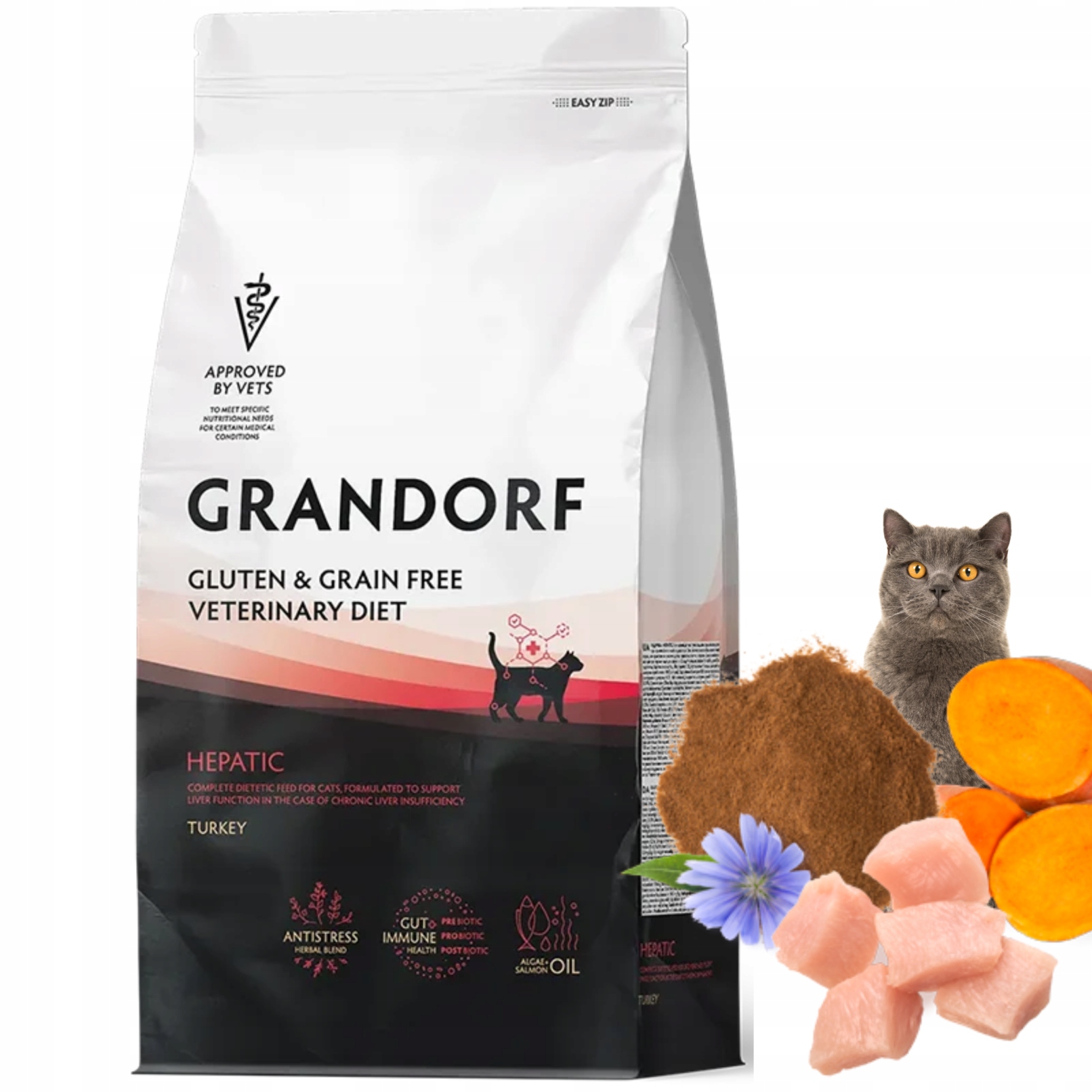 Grandorf Veterinary Diet Cat Hepatic Turkey to specjalistyczna karma sucha przeznaczona dla kotów z chorobami wątroby. Wyróżnia się wysoką zawartością mięsa z indyka, niską miedzią oraz formułą nastawioną na minimalizację obciążenia metabolicznego, co jest kluczowe u kotów z niewydolnością wątroby, stłuszczeniem czy przewlekłym zapaleniem wątroby.